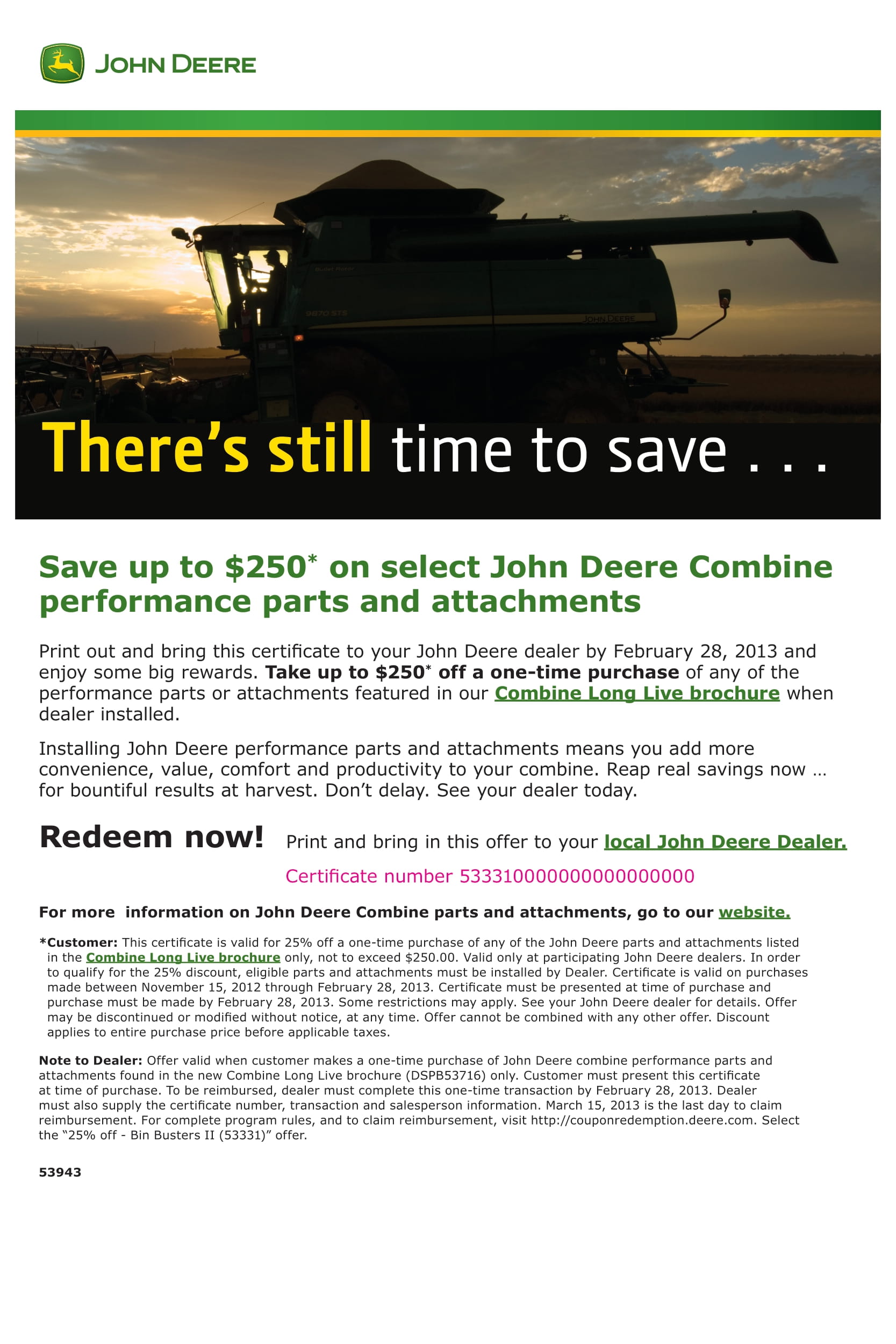 Solution: We produced a digital coupon delivered to Deere customers offering $250 in savings on parts and attachments redeemable at their nearest dealer.